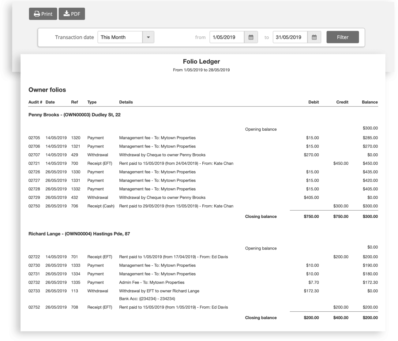 Folio Ledger shows details for all transactions that travel through owner, supplier, tenant and sales folios.